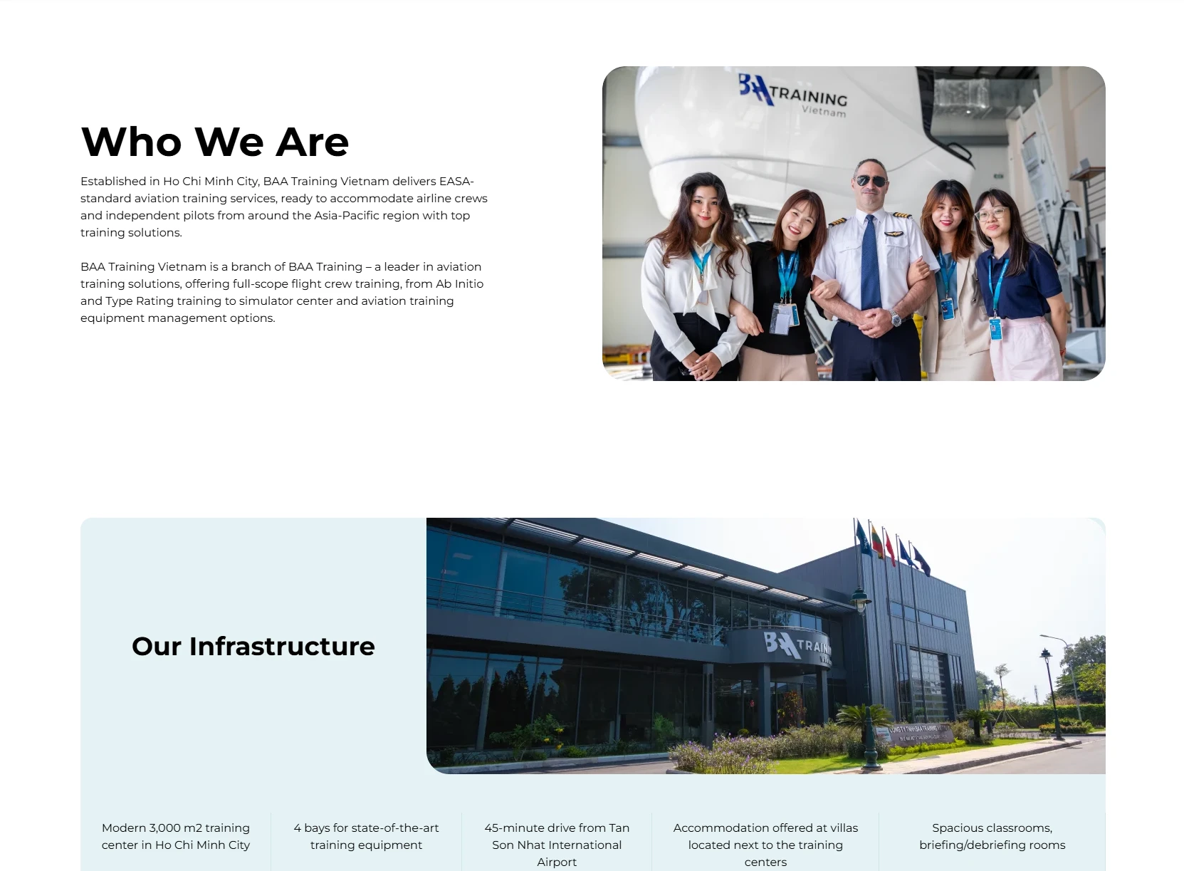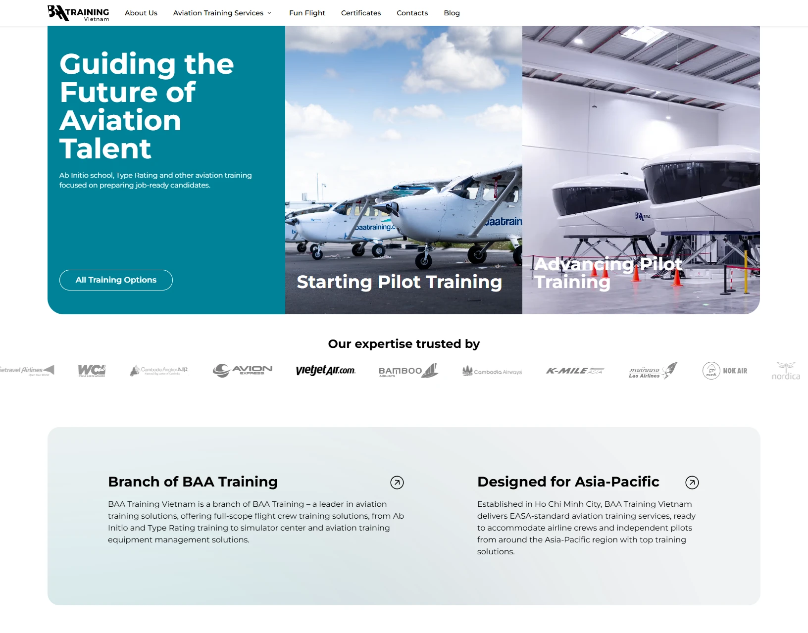 - BAA Training Vietnam is one of our latest projects in the aviation space. Our team redesigned and developed the new website, giving a fresh and modern look, lightning-fast speed and effortless user experience.