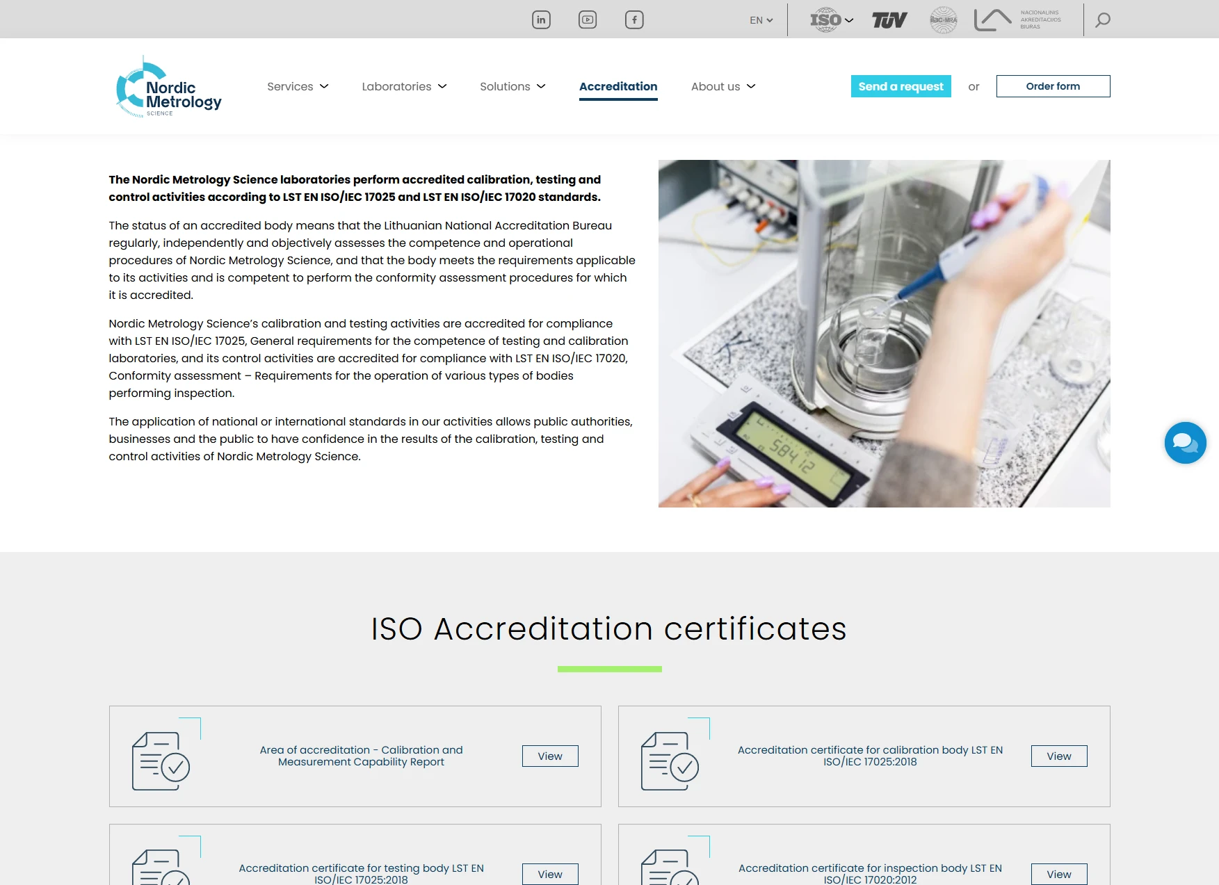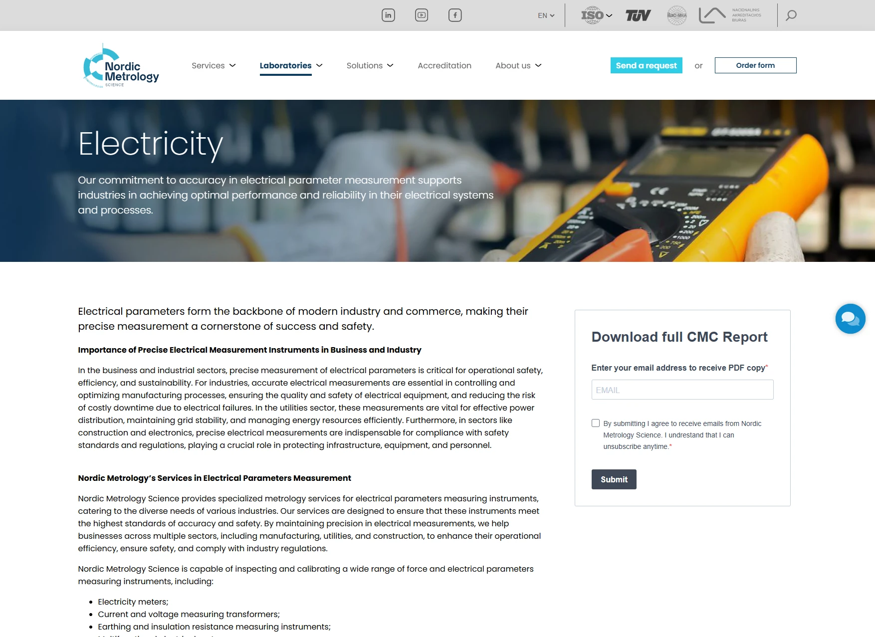- The main challenge in developing the Nordic Metrology Science platform was to create a modern, user-friendly, and highly functional website that effectively communicates their wide range of metrology services. Ensuring a clear structure for complex technical information while maintaining an engaging, professional design was crucial. Additionally, the platform needed to be highly performant, SEO-optimized, and compliant with industry standards to establish credibility and visibility in the European market.